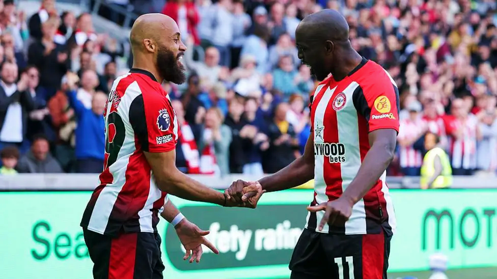 Mbeumo dan Wissa meluapkan kegembiraannya usai mencetak gol. Foto: via BBC