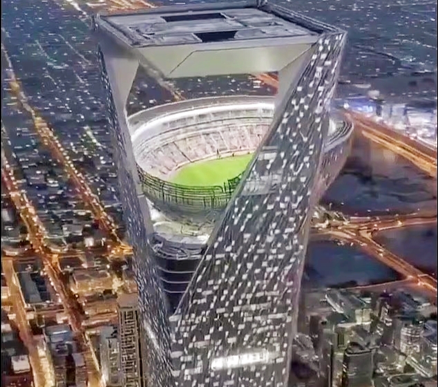 Dalam video tersebut, stadion tampak berdiri megah di antara gedung-gedung tinggi dan disebut hanya bisa diakses melalui lift berkecepatan tinggi.